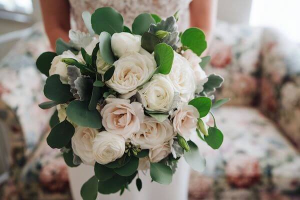 Melynda looked amazing in her organza and lace Stella York wedding gown. Her bridal bouquet, ivory, and blush roses with ranunculus and dusty miller, was accented with three family lockets.