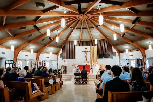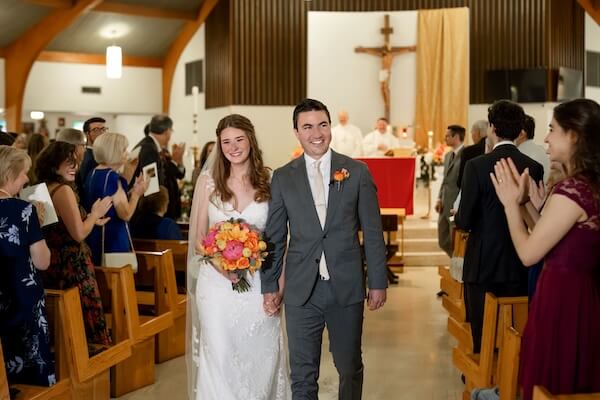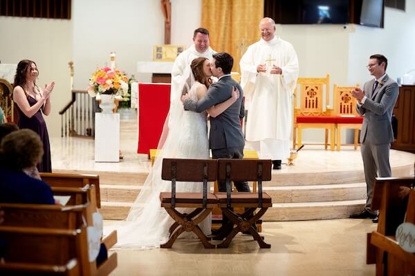 The couple, surrounded by family and friends, participated in a Nuptial Mass. Following exchanging rings, the newlyweds sealed their vows with a kiss.