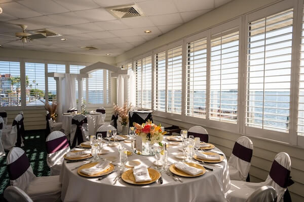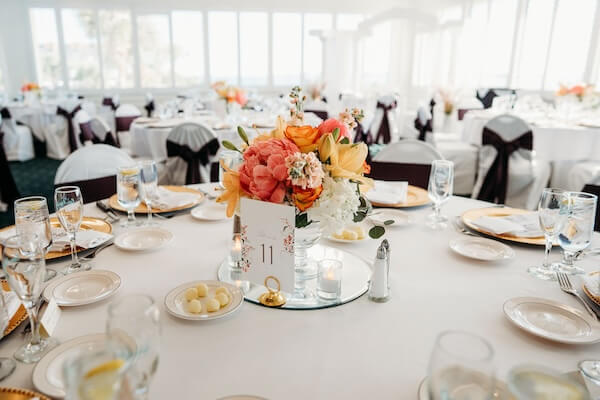 After cocktail hour, guests entered the ballroom overlooking the Gulf of Mexico. The room was set with tables draped in crisp white linens, topped with gold charger plates, custom napkins, and beautiful floral centerpieces.