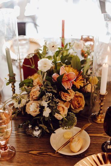 Inside, all of the details for the wedding reception were in place. Wooden tables with brightly colored runners and napkins were dressed with eclectic collections of vintage bottles, vases, and candlesticks with whimsical floral arrangements. Gold charger plates were preset with the salad course.