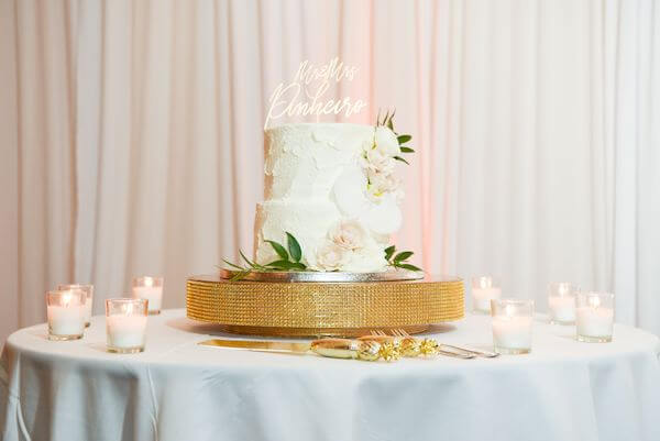 Inside the ballroom, tables were draped in crisp white linens and decorated with arrangements of white tropical flowers and lush greenery, accented with gold risers and gold votive candles.