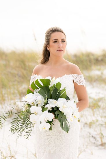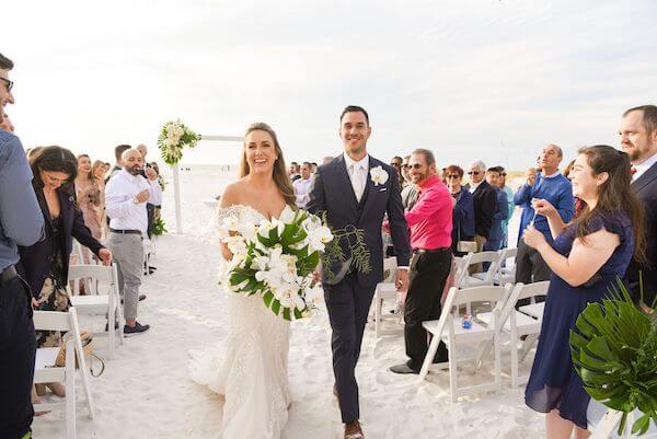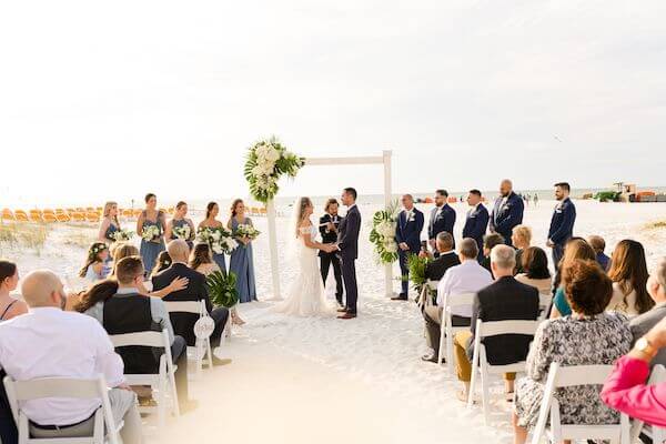 The beach outside of the Sandpearl Resort was set with white garden chairs that led to a white ceremony structure draped with fresh white flowers.