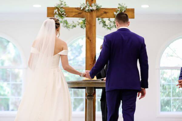 The couple, family, and friends made their way to the chapel. The classic white wedding chapel was decorated with white lanterns lining the aisle. At the end of the aisle stood a rustic wooden cross draped in greenery and white flowers.