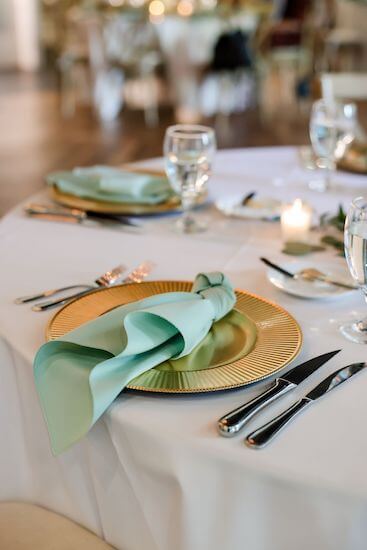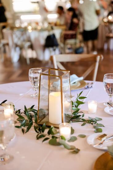 The couple joined their guests in downtown St. Pete where the venue was set with crisp white linens, gold charger plates, and sage napkins. Gold and glass lanterns dotted with white flowers filled the center of each table.