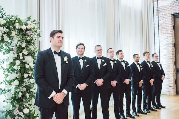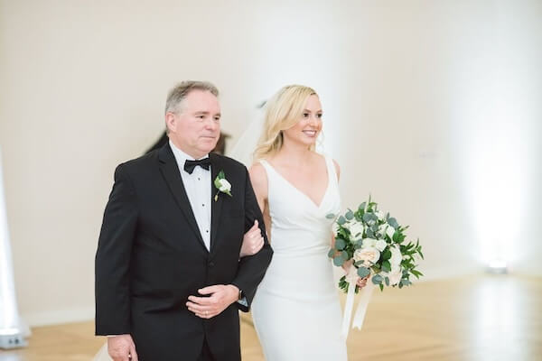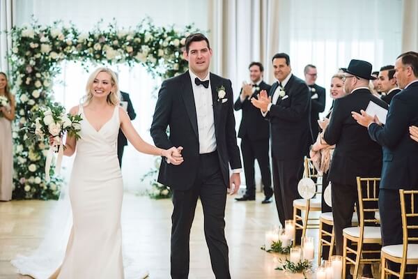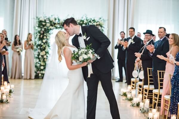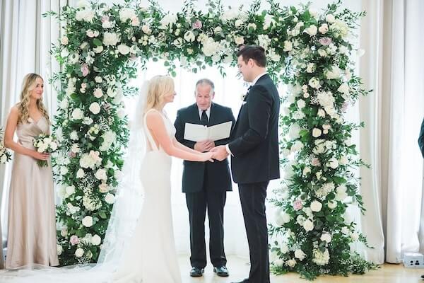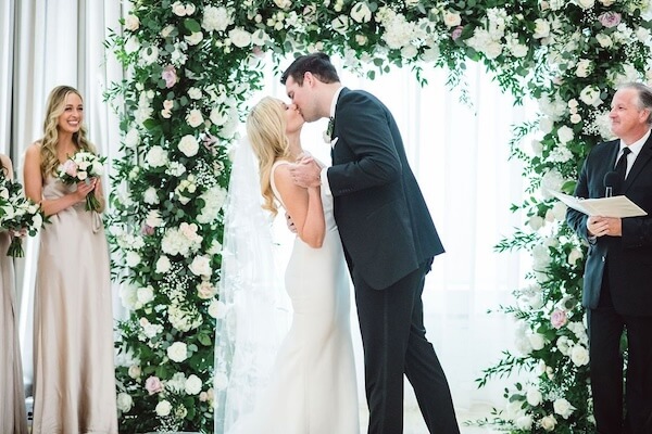 Inside the ballroom, all the details were in place for the couple’s wedding ceremony. Gold Chiavari chairs lined the aisle, adorned with lush greenery and glass cylinders with pillar candles. The ceremony structure overflowed with foliage and soft flowers, making the perfect backdrop for the ceremony.