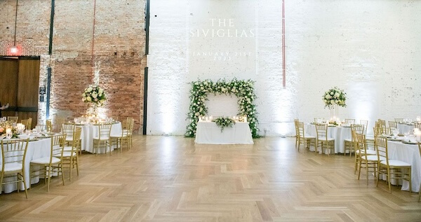 The couple’s intimate, two-tiered white wedding cake was off to one side. Fresh flowers, a gold riser, and candles popped against the rustic red brick wall.