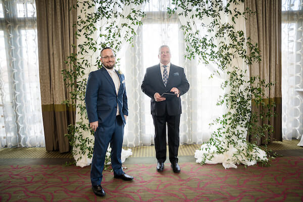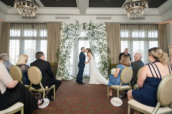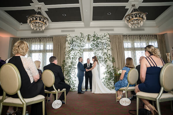 Beautiful white fabric draping created an intimate space inside The Birchwood ballroom for the couple’s wedding ceremony.