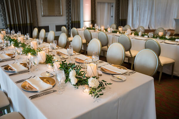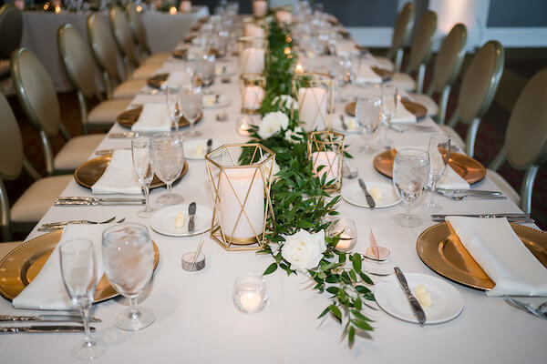 Inside The Birchwood’s ballroom, long tables were draped with crisp linens. The center of each table was designed with long ropes of greenery dotted with beautiful flowers, modern gold geometric candle holders, and votive candles. Gold charger plates paired perfectly with the tablescapes gold accents.