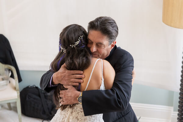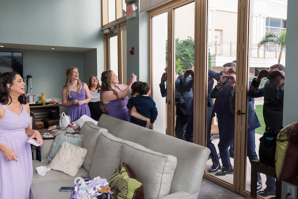 After stepping into her beautiful wedding gown, Chelsea took time for a first look with her father. Then she met up with her wedding party, and while taking a short break to freshen up, the guys tried to get in on the act.