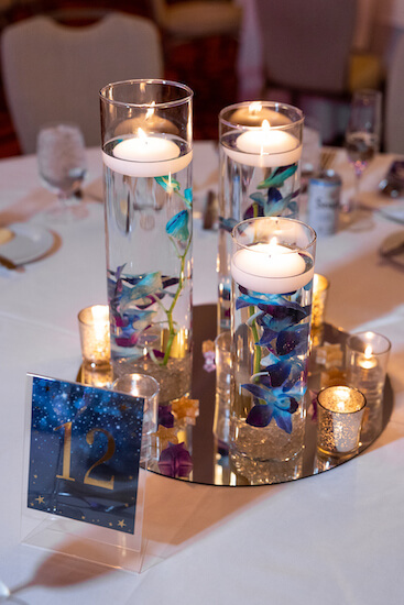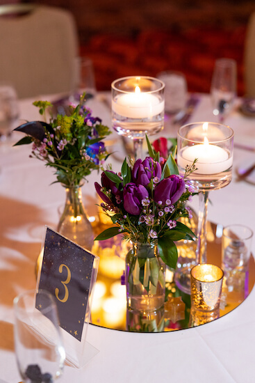 The ballroom was washed in beautifully colored lighting. Tables were draped in crisp white linens and set with floating candles and purple floral centerpieces on mirrored tiles. Additionally, each place setting contained a Brookie as a wedding favor for their guests. These sweet treats were out of this world!