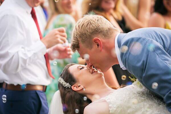 Sealing their vows with a kiss, the couple made their way up the aisle through a shower of bubbles, stopping long enough for a kiss.