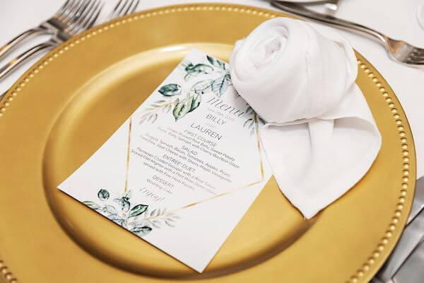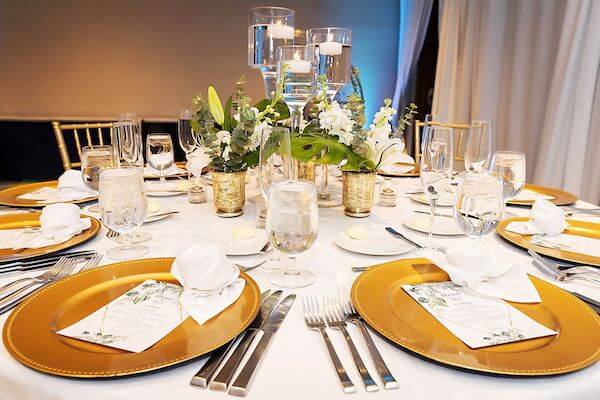 Inside the resort’s Sea Salon Ballroom, tables were set with white linens and gold charger plates. Each place setting included a custom menu card and a napkin tied in a beautiful rose. The center of each table held floating candles in glass vessels surrounded by gold vases of flowers and votive candles.