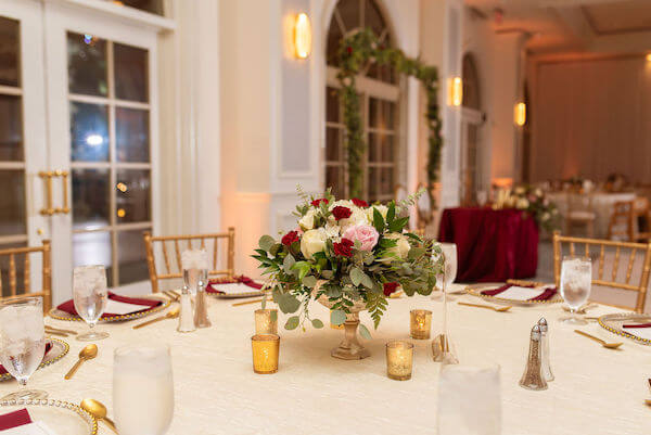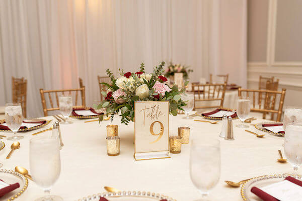 The ballroom was set with crisp white linens. Place settings included glass charger plates with gold bead edges, gold flatware, and bright red napkins layered with custom menu cards. Centerpieces of white, pink, and bright red filled gold urns and were surrounded by gold votive candles and gold-toned table numbers.