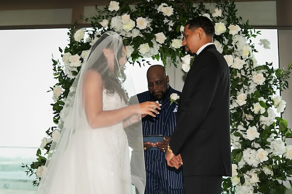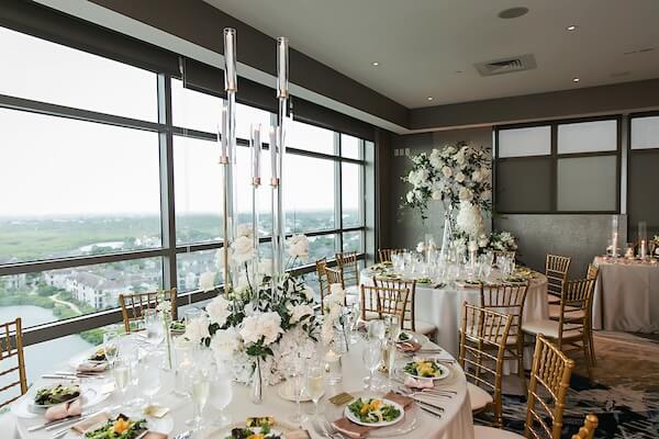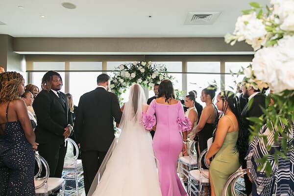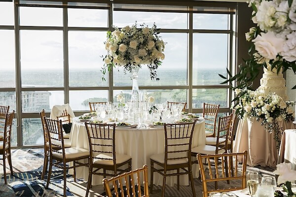 BluVu, located at the top of the hotel, has wall-to-wall windows overlooking Tampa Bay and the skyline. A beautiful white floral arch and an aisle filled with floral arrangements add to the stunning backdrop.