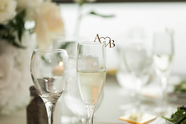 Inside BluVu, tables were draped in Champagne-colored linens. Gold chiavari chairs and gold-toned napkins added warmth to the modern tablescape of glass and candles that overflowed with white flowers. We loved the little touches like the monogrammed accents on each Champagne glass.