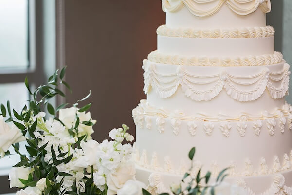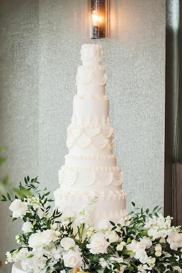 Off to one side was Briana and Alex’s spectacular eight-tiered wedding cake. We love the incredible details in this classic design.