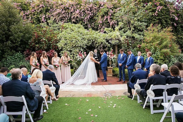 After getting ready offsite, the bride and groom arrived at the gardens separately with their wedding parties and family.