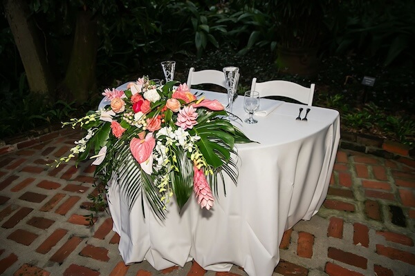 As darkness fell, the garden’s beautiful twinkle lights illuminated tables set with crisp white linens and modern metallic risers holding floral creations of tropical greenery and flowers.