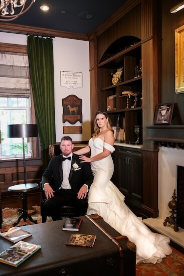 Bride and groom taking a sneak peek at their reception in the Tiffany Room of the Belleview Inn.
