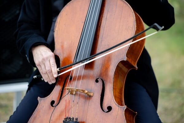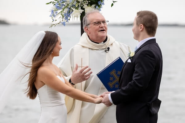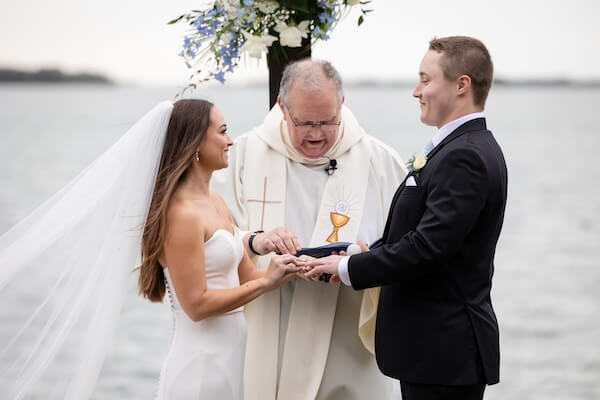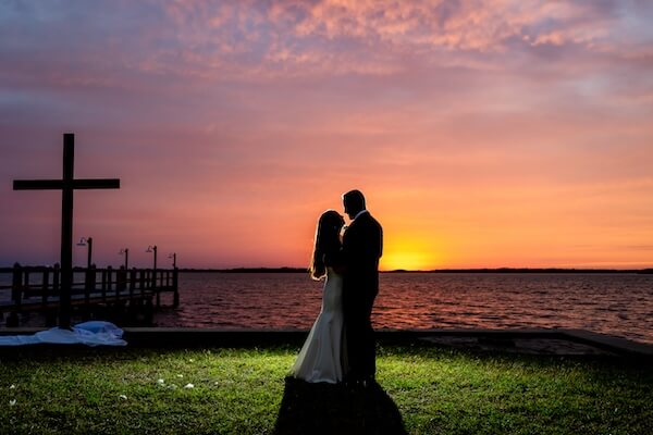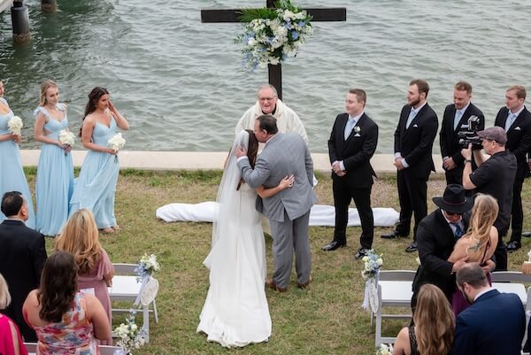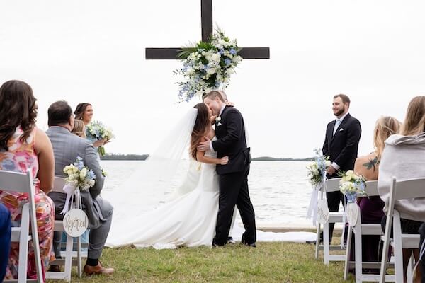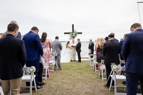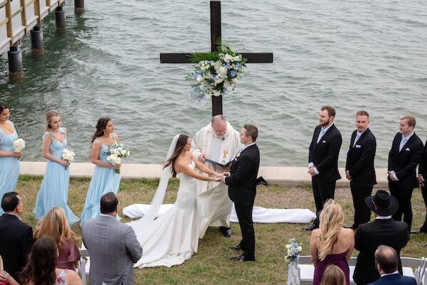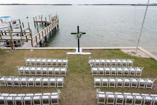 On the waterfront just outside of Tampa Bay, white garden chairs created an aisle adorned with fresh flowers. A simple wooden cross, dressed in flowers, created the perfect backdrop. The addition of a string duo added to the atmosphere.