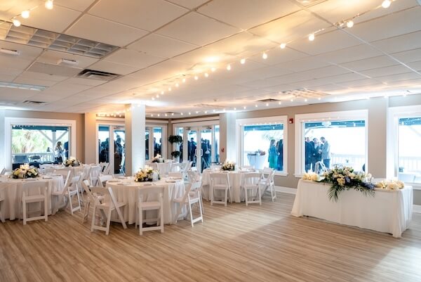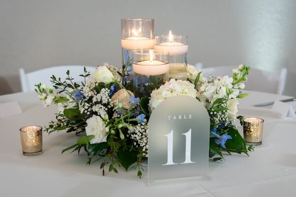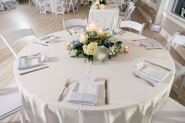 The second-floor Tampa Bay Watch ballroom overlooking the waterfront was set with white garden chairs and tables draped in white linen. Light blue napkins, paired with custom menu cards, and accented with blue and white flowers, along with floating candles, completed the look.
