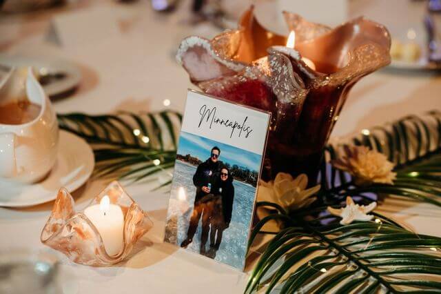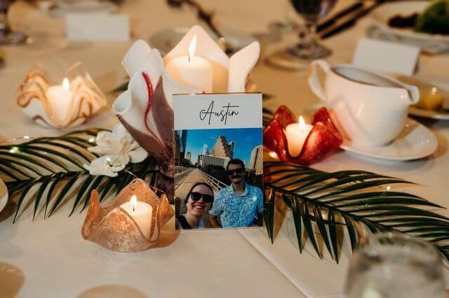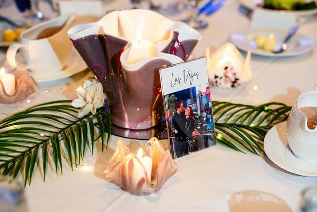 Each table contained a fun photo of the couple in that location. The decor for each table included vases and candle holders made of colorful fused glass created by the bride’s mother! They were accented with palm fronds, sea shells, and tropical flowers.