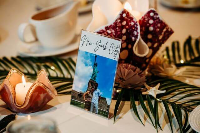 Guests would be greeted by a seating chart reading ‘Safe Travels To Your Seat’ that included tables labeled with several of the couple’s favorite travel locations.