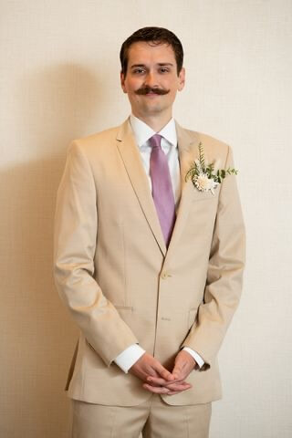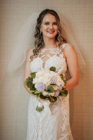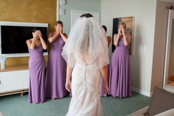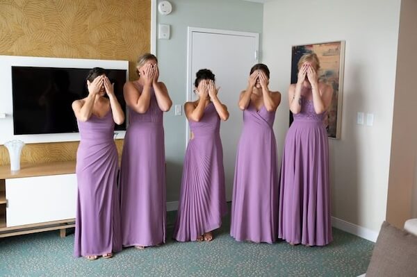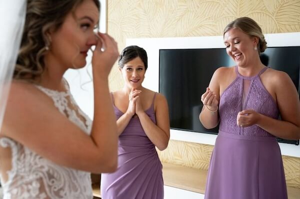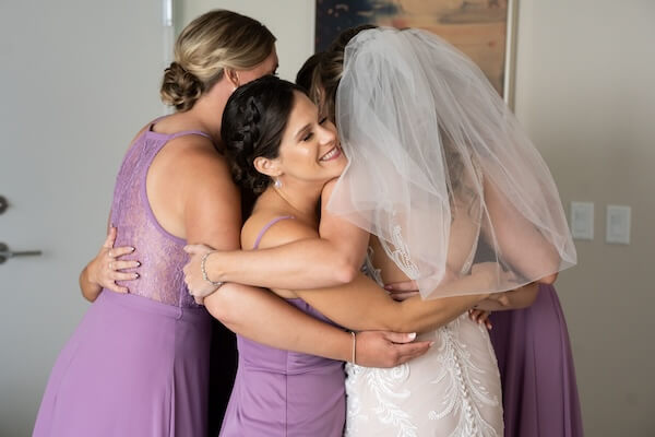 The next reveal was to her incredible bridal party. We love their beautiful light purple dresses. They were part of a color story that incorporated light purple, tan, and touches of greenery.