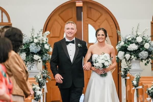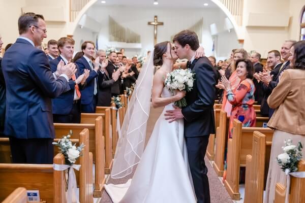 With everyone in their places, Emily, escorted by her father, made her entrance to Cannon in D. The two exchanged vows and rings, surrounded by family and friends. Sealing their vows with a kiss, the newlyweds made their exit to the Wedding March.