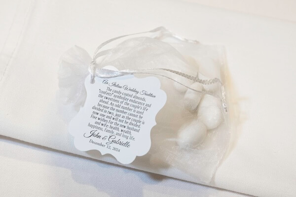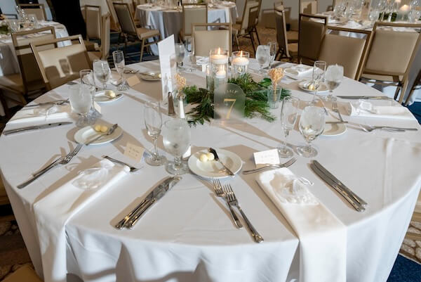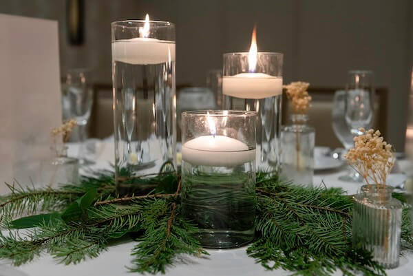 Inside the ballroom, tables were draped in crisp white linens. The tables were accented with floating candles, holiday greenery, and tiny vases of baby’s breath. Each place setting contained a traditional sachet filled with five white Jordan Almonds.