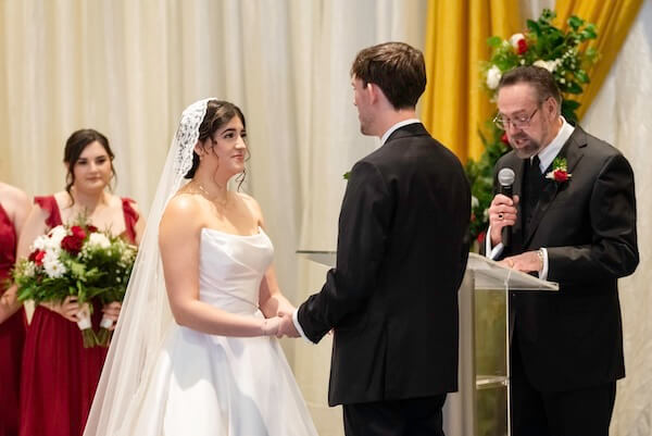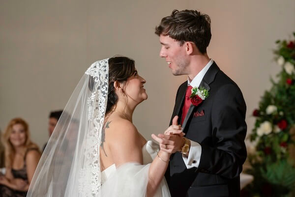 The couple’s sweetheart table was decorated in holiday colors, and the draping behind the table made the perfect accent. Off to one side was their beautiful, three-tiered wedding cake, complete with a custom cake topper.