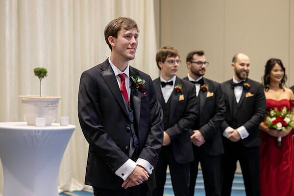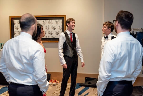 John hung out with his wedding party, dressing, and enjoying time together before heading downstairs for some special time with his bride-to-be.