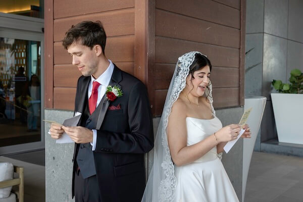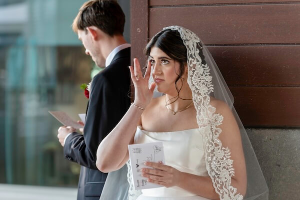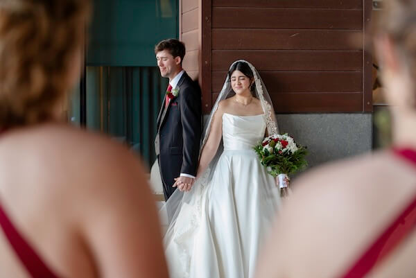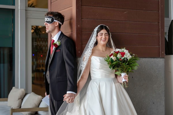 Gabby and John decided that rather than a “First Look,” they would have a first touch. With “Bride” and “Groom” sleeping masks as blindfolds, the two stood side by side, just around the corner from each other.