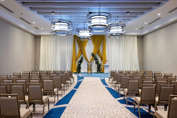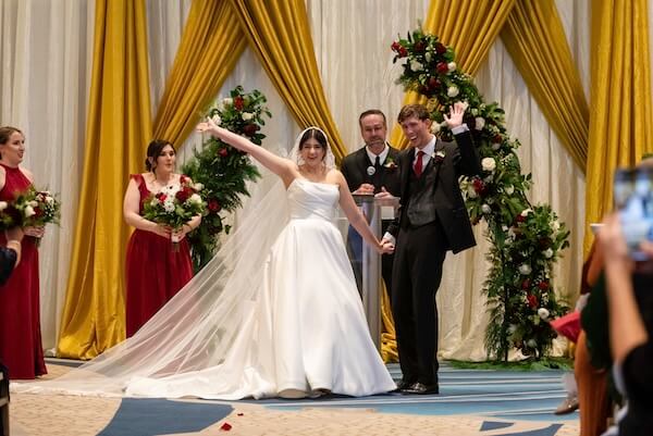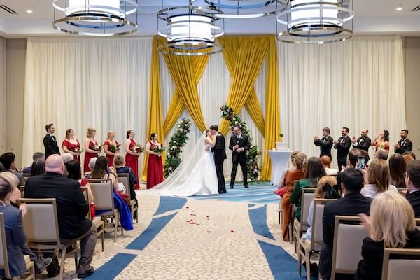 The ballroom was set with elegant draping as a backdrop for the couple’s wedding ceremony, accented by a beautiful floral wedding structure.