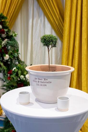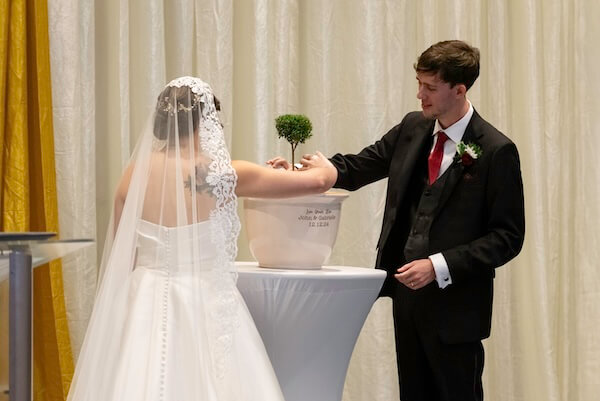 Gabby and John exchanged wedding rings, read wedding vows to each other, and included a Tree Planting Ceremony before sealing their vows with a kiss and exiting to “Now and Then” by the Beatles.