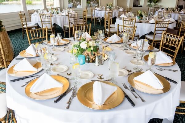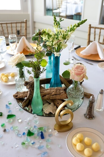 Inside the venue’s ballroom, tables were draped with crisp white linen. Gold charger plates, Chiavari chairs, and table numbers added a little shimmer. The center of each table was dressed with a mirrored tile and eclectic floral arrangements. Shells, driftwood, and sea glass added unique touches to each table.