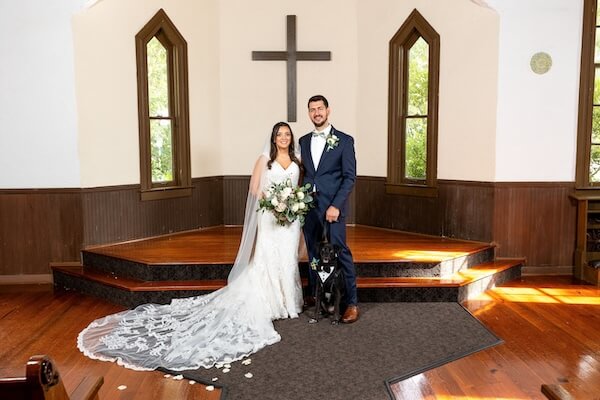 Our bride and groom and Jackson took some time for photos around the chapel before rejoining gin guests for cocktails and hors d ‘oeuvres.