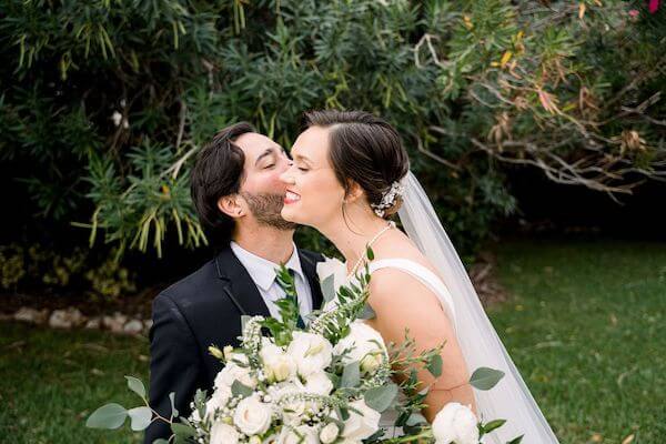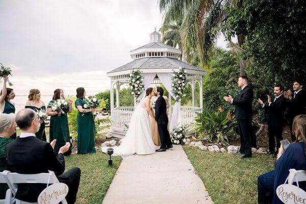 The wedding pavilion was draped with flowing white fabric and accented with large boughs of white flowers. With Tampa Bay as the backdrop, it was a beautiful setting for their wedding ceremony.