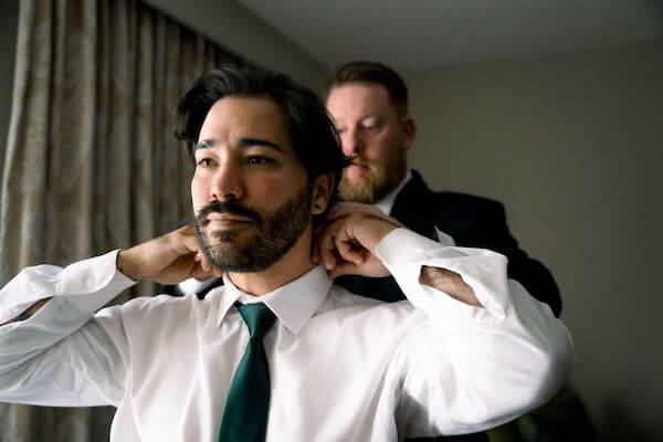 Across town, Daniel was having photos taken as his Best Man helped him get ready, and then the guys did their group photos.