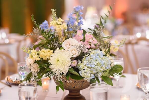 Inside, the ballroom was set for a spectacular wedding reception. Soft lighting, draping, a hedge wall with custom signage, and incredible floral centerpieces set the stage for a beautiful wedding reception.
