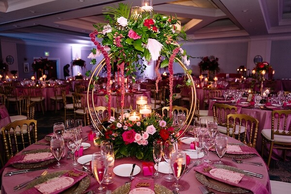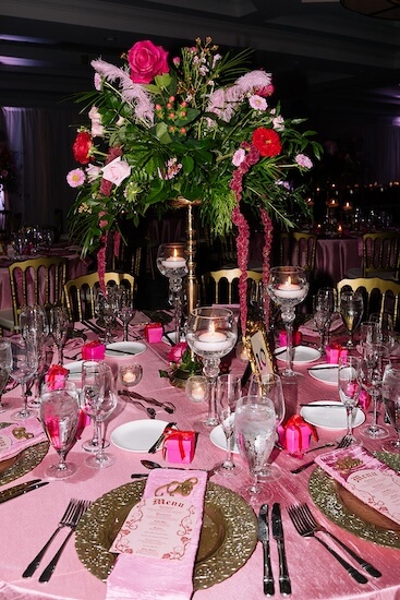 Inside the ballroom, the space was layered in a shade of pink and red with an accent of gold. A gold-patterned charger plated with pink napkins cascading over the edge was layered with custom menu cards and name plaques.