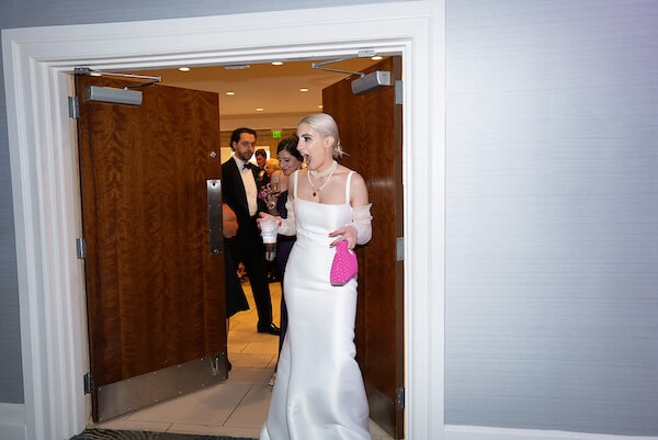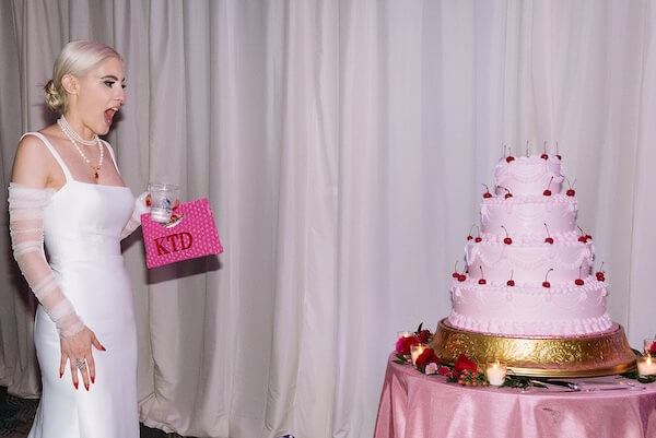 Kali and Zach took some time away from the cocktail hour for a quick sneak peek at the reception decor. We’re pretty sure they loved what they saw. And how adorable that pink cake is, not to mention Kali’s purse!