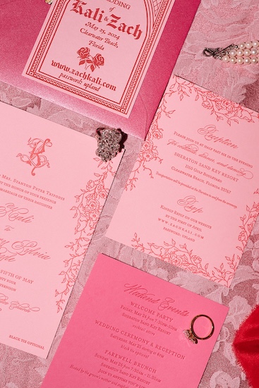 The color story for the wedding was shades of pink and red with gold and white accents. Everything, from invitations to signage, personal touches, and accessories, was bold and beautiful.