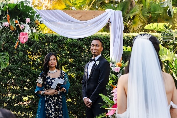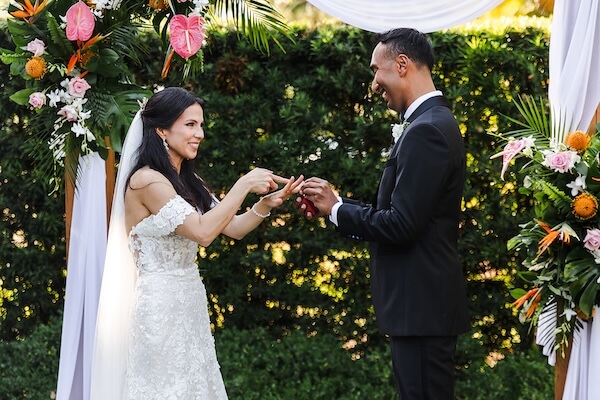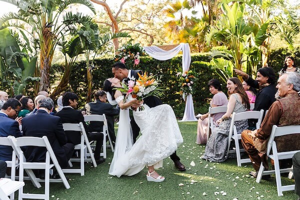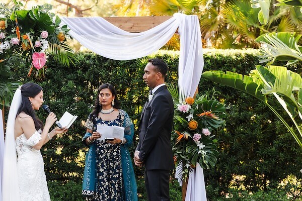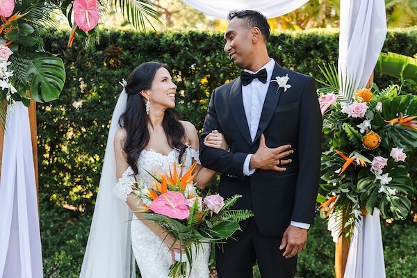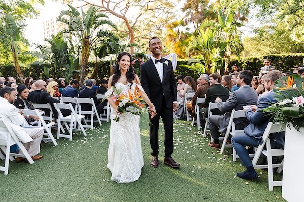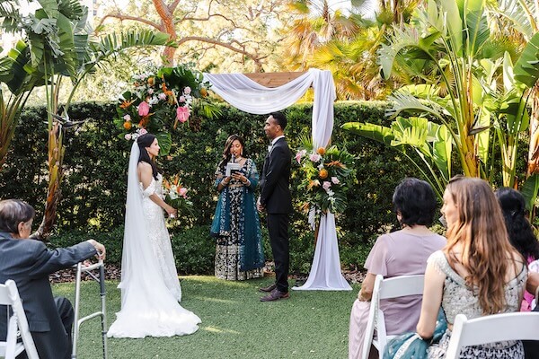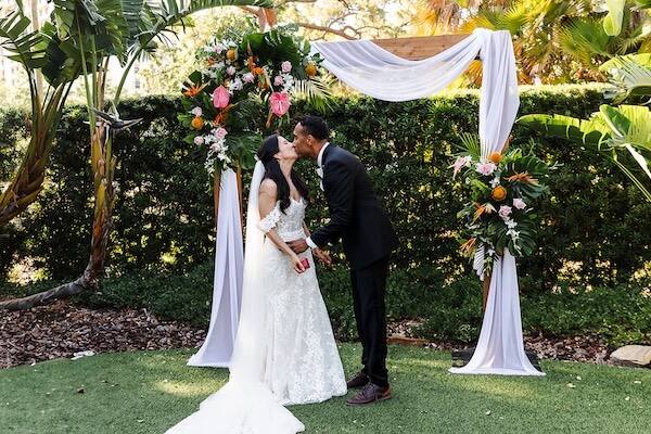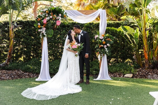 The outdoor ceremony space at Tampa Garden Club featured white garden chairs. Two columns with tropical floral arrangements marked one end of the aisle, while a beautiful arch draped with fabric and flowers decorated the other.