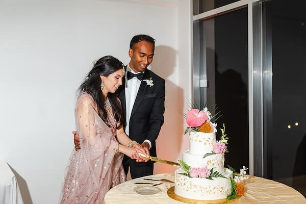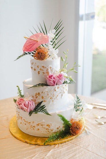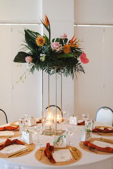 Inside the ballroom, tables were covered with white linens and adorned with tropical floral arrangements—the eclectic decor combined gold-toned risers and urns, adding visual interest. The tablescape featured handwoven mats, wedding favors, and hand-tied napkins.