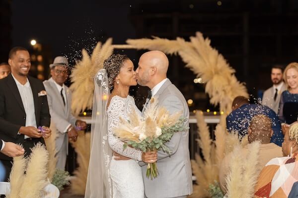 Up on the roof, the venue’s hexagon-shaped wedding structure was decorated with lush pampas grass leading up the aisle.
