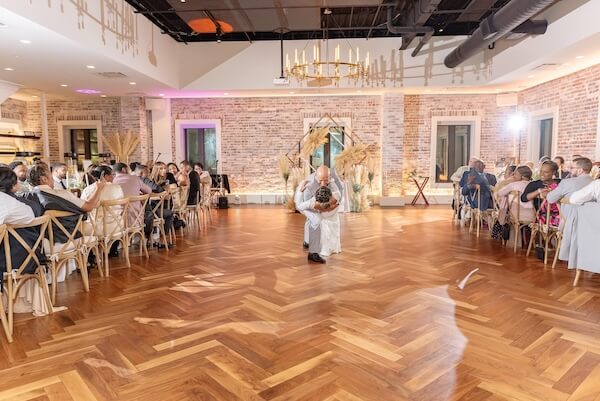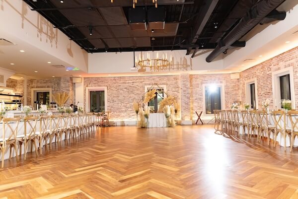 Long tables were draped with crisp linens and layered with gold-toned charger plates, grasses, flowers, and candles. The Boho details worked well with the venue’s exposed brick and herringbone-patterned wood plank floors.