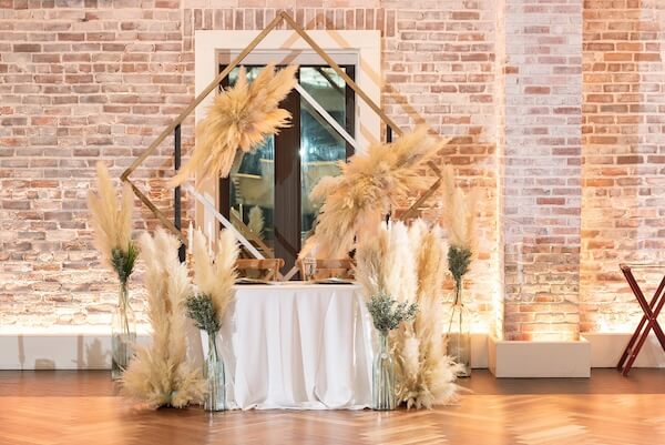 The beautiful wedding structure and lush pampas grass were relocated inside the ballroom to frame the couple’s sweetheart table.