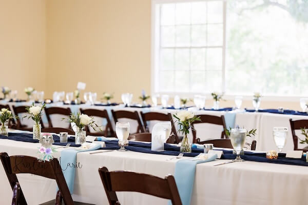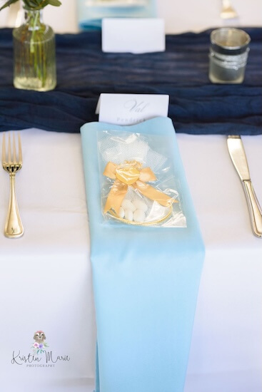 A series of long tables were set with crisp white linens, a navy blue runner, and light blue napkins in a waterfall fold. Tables were dotted with bud vases filled with fresh white flowers and silver-rimmed votive candles. Each place setting was set with Jordan Almonds.