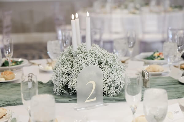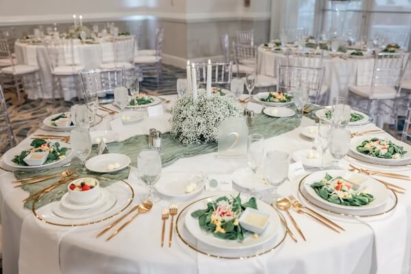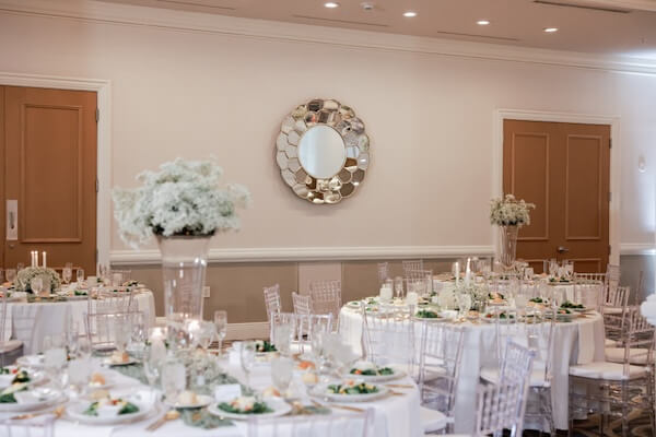 Inside the hotel’s ballroom, tables were draped with crisp white linens and surrounded by clear acrylic chairs. Tabletops were dressed with white taper candles and clouds of white baby’s breath. Each place setting had a glass charger plate with a gold rim, paired with matching gold flatware.